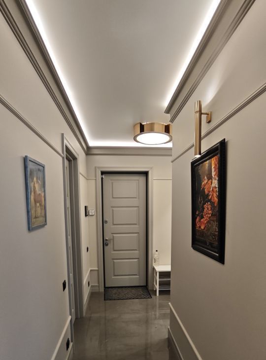 В процессе организации освещения в спальне и гостиной были задействованы, в частности, подвесные и точечные светильники, что придаёт интерьеру особый шарм. В кухонной зоне смонтирована система подогрева пола. Шторы блэкаут позволят продлить часы сна