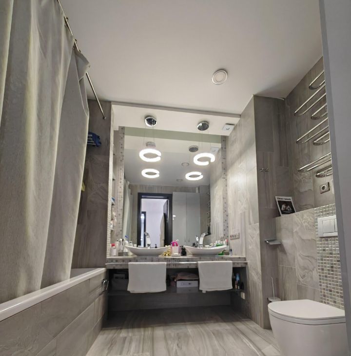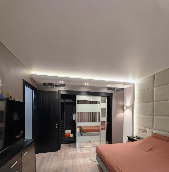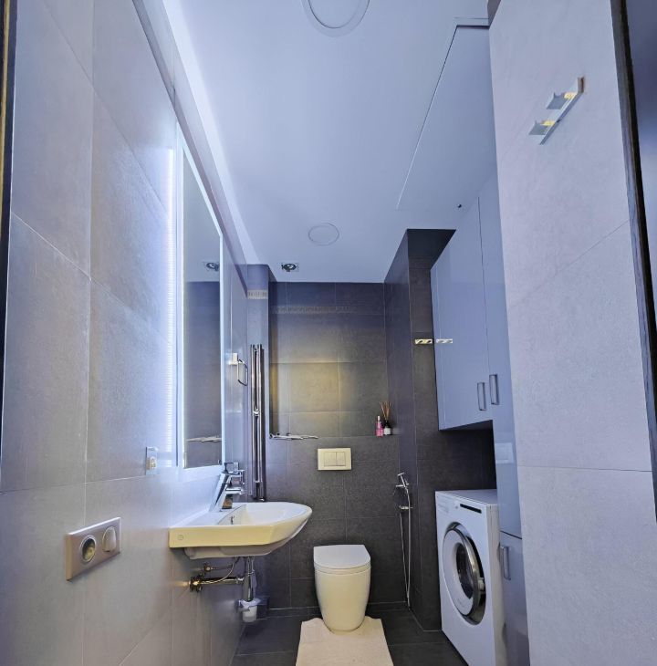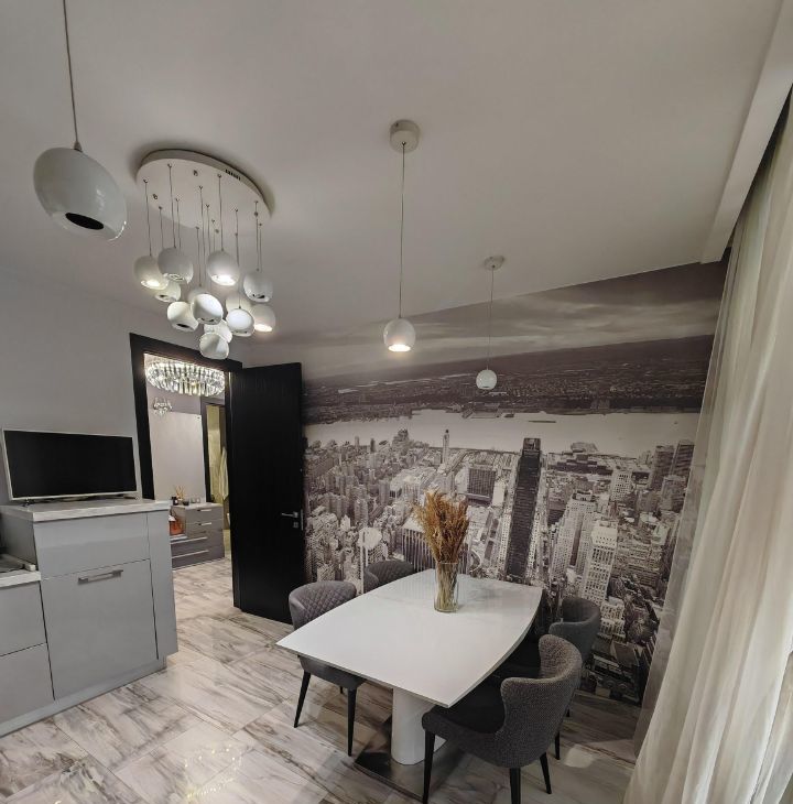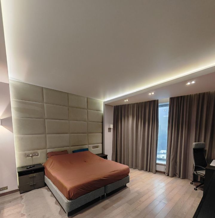В квартире выполнен дизайнерский ремонт с использованием качественных материалов. Планировка включает две просторные комнаты : в одной комнате двухспальная кровать, гардеробная комната, во второй комнате удобный раскладной диван, кухню, оборудованную всей необходимой мебелью и техникой, включая посудомоечную машину, холодильник , микроволновую печь,духовой шкаф. В квартире установлена канальная система кондиционирования, по всей квартире теплые полы для вашего комфорта. Два санузла : Ванная комната оснащена современной сантехникой и ванной, второй совмещенный отдельный санузел ,в котором установлена стиральная машинка.Просторная Лоджия выходит во двор, где вы сможете наслаждаться тишиной и уютом.