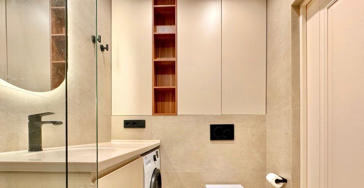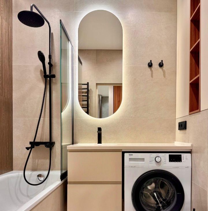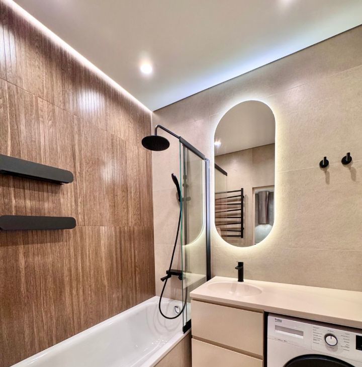 Ванная комната совмещённая, есть и ванна и современный душ с перегородкой. Также вместительные шкафчики и стиральная машина .