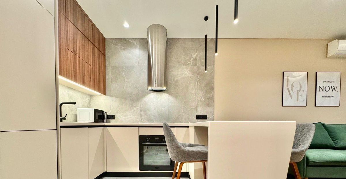 Гостинная , совмещённая с кухней. Кухня оснащена всей необходимой техникой- посудомоечная машина, микроволновка, духовка , вытяжка, чайник, посуда.