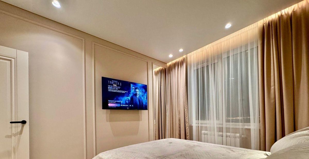 Спальня ( 12м2)- гарнитур из двухспальной кровати с матрасом, покрывалом и двух тумбочек. Большой телевизор и кондиционер.
