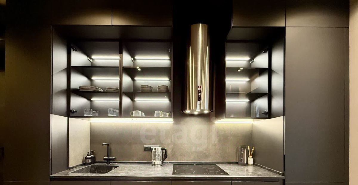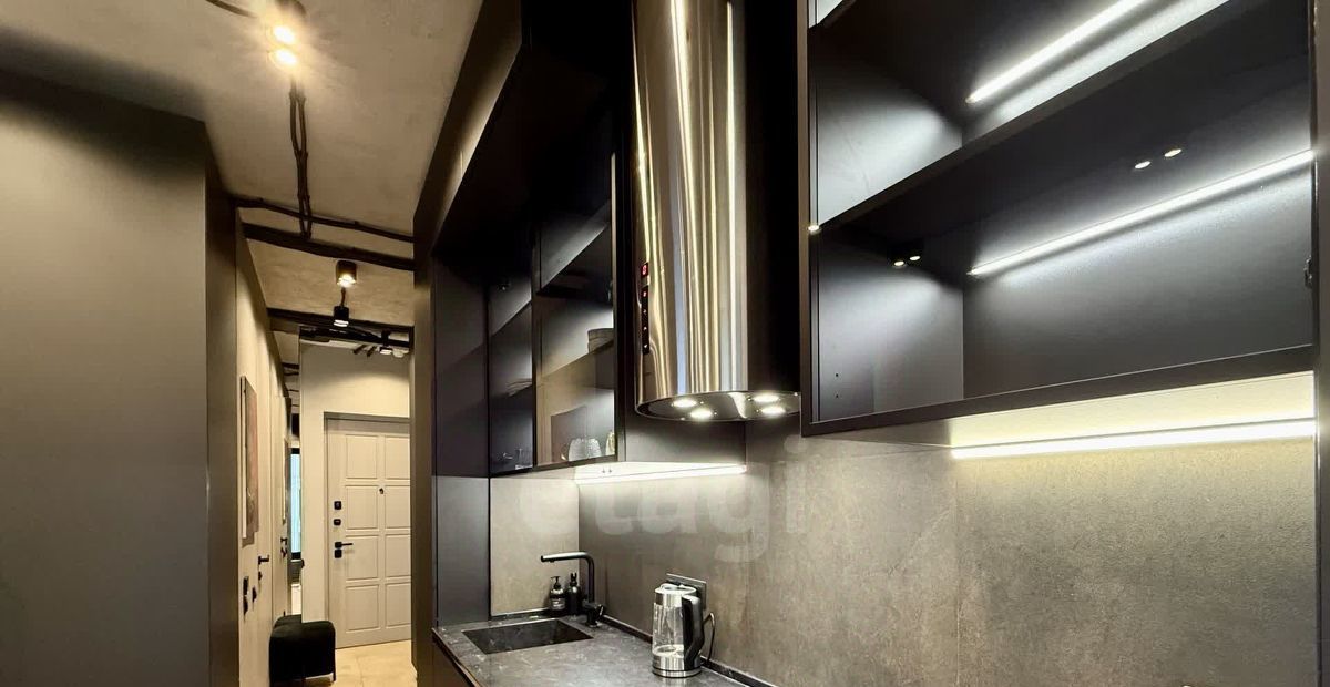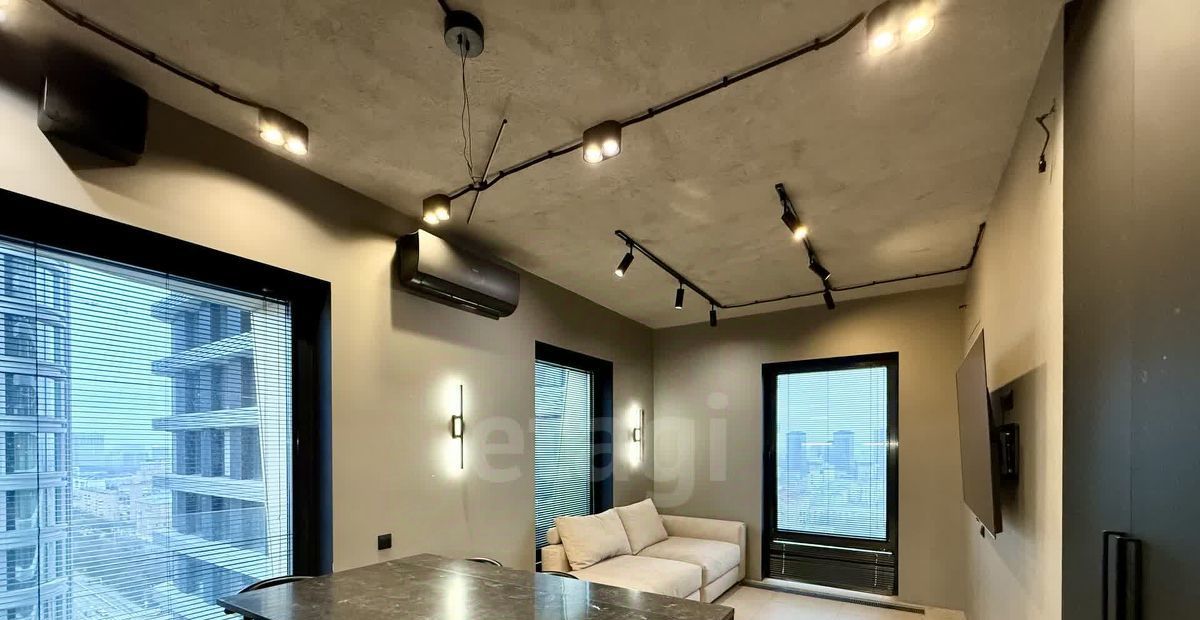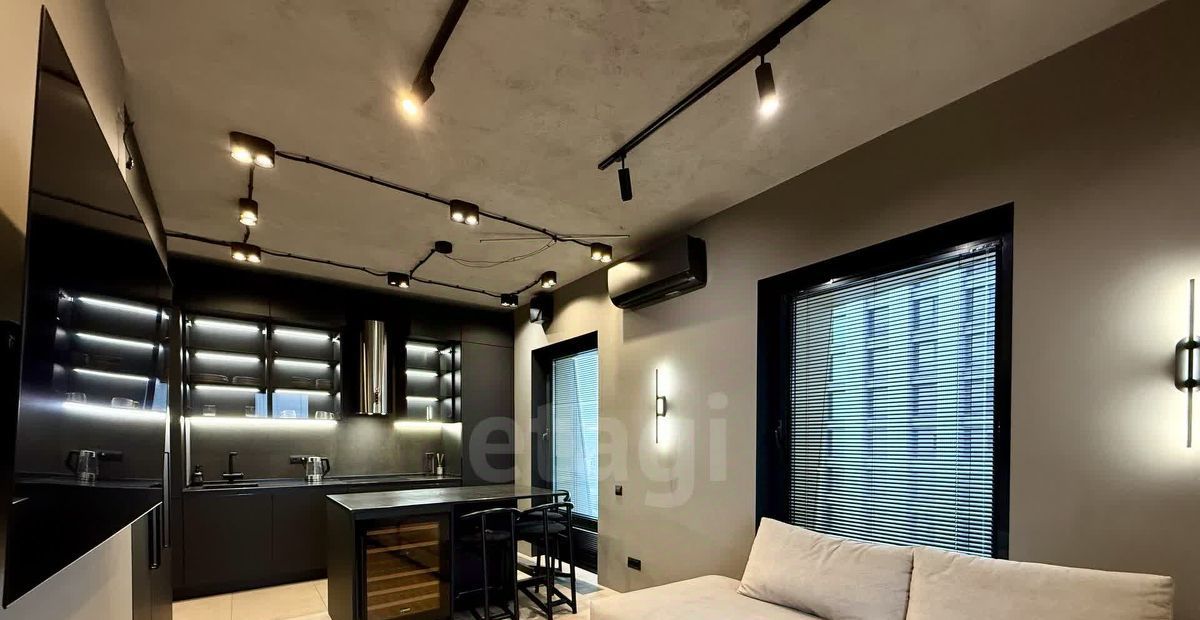 Спальня выделена в отдельную комнату. Остальное пространство зонировано под кухню-гостинную с мягкой зоной. В квартире сделан евроремонт, установлена необходимая качественная мебель и техника.