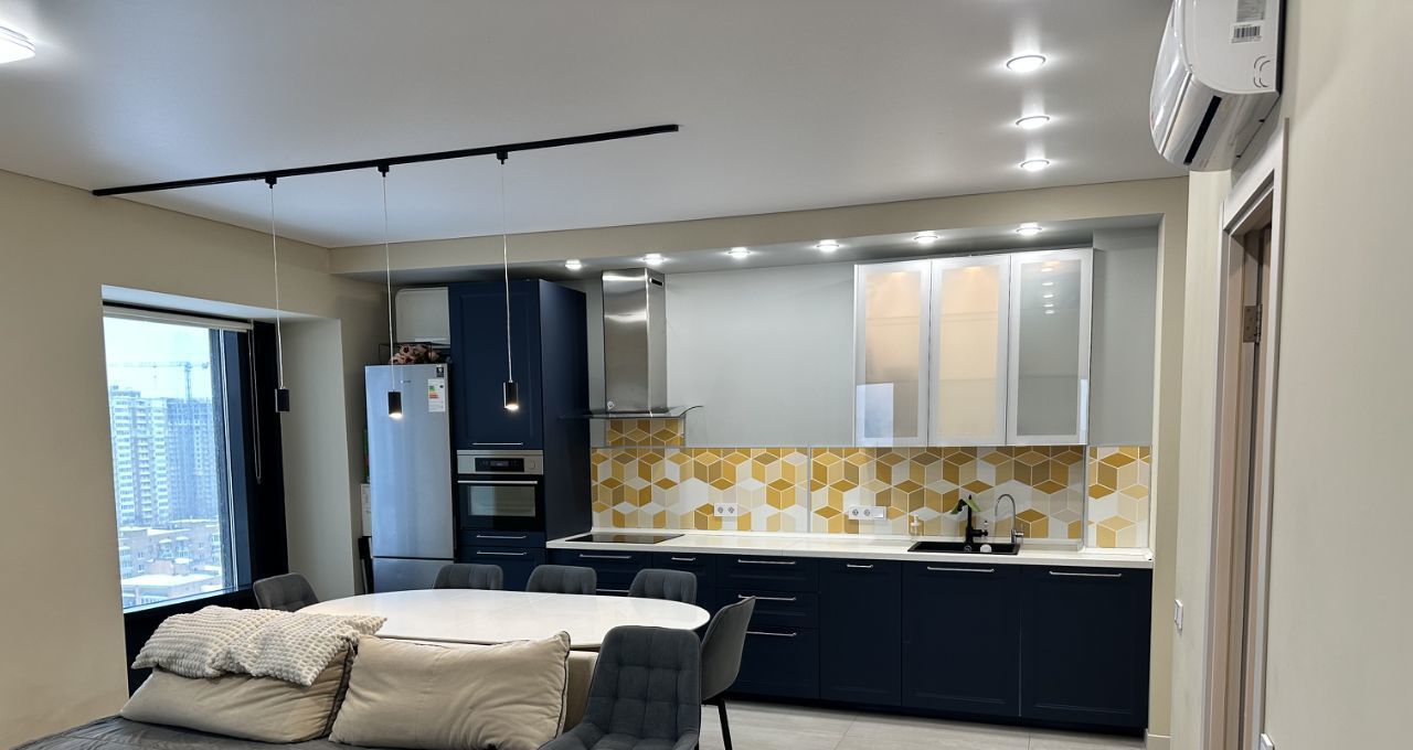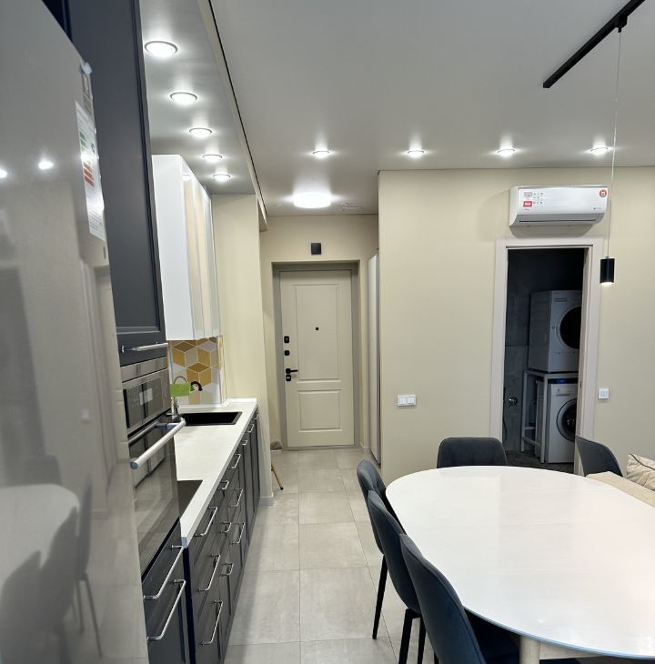 просторная гостиная с кухней (бытовой техникой, посудомоечной машиной и посудой),