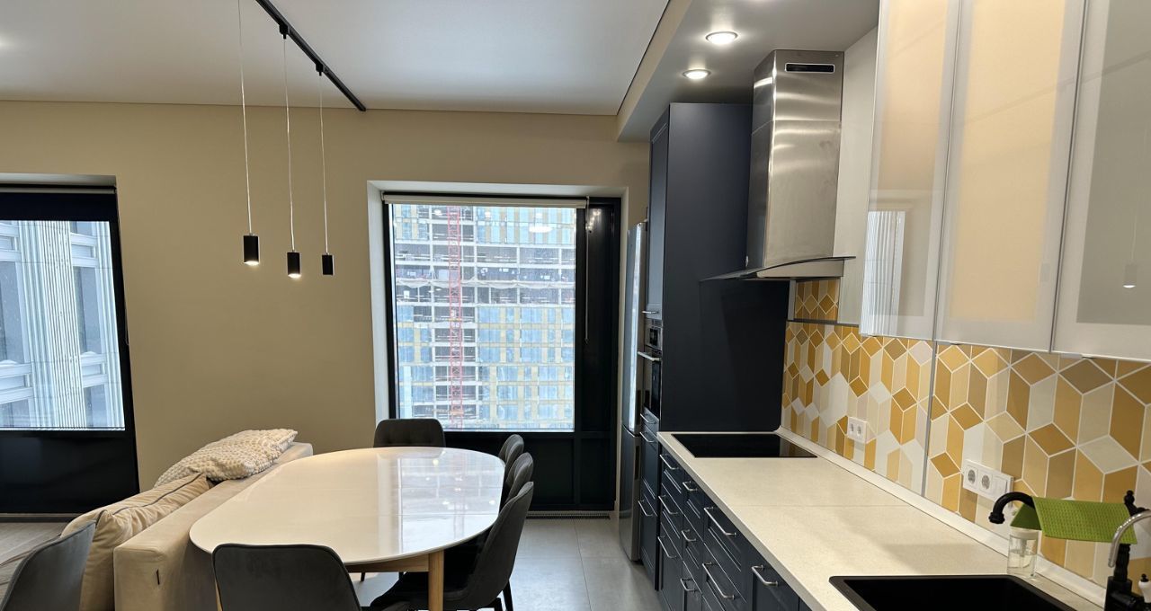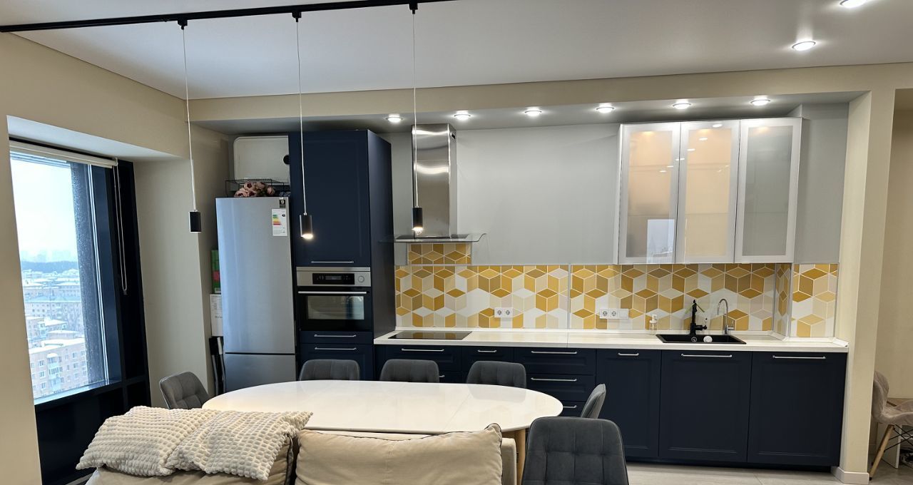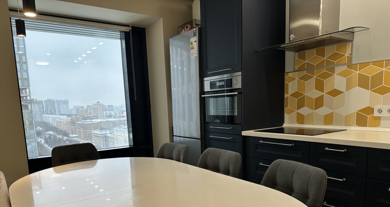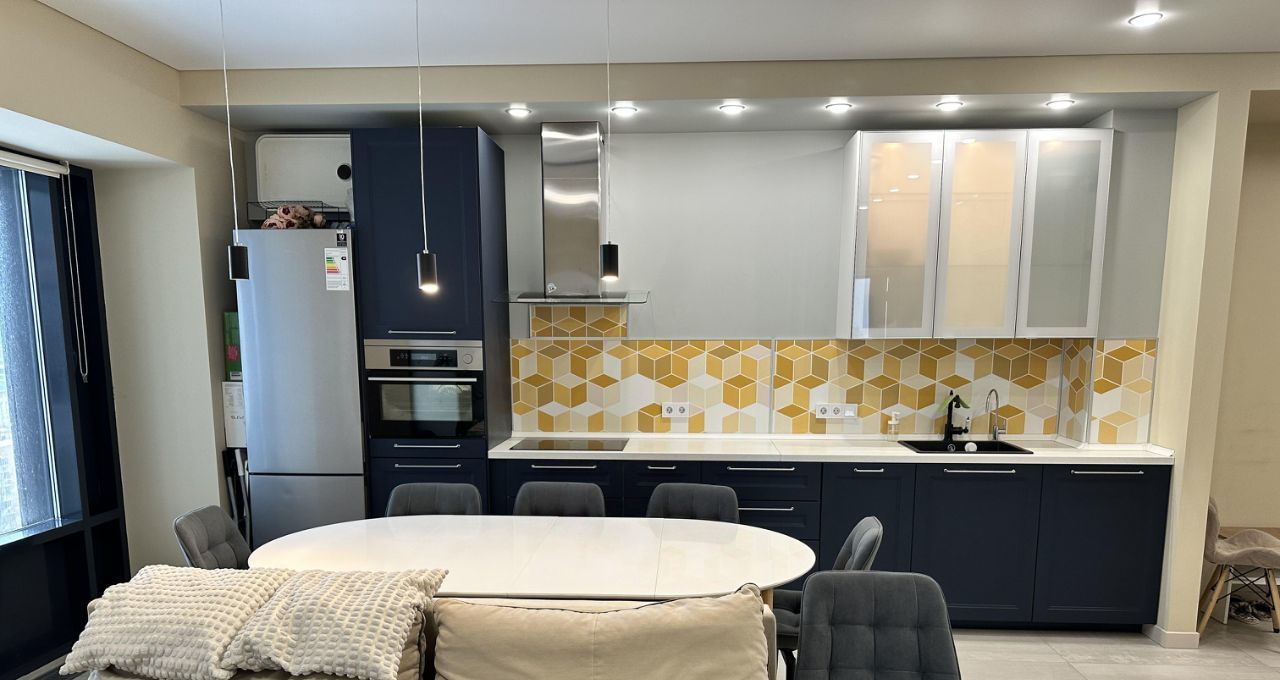 Кухня укомплектована бытовой техникой (печь пароварка+гриль, индукционная плита, посудомойка, вытяжка, капсульной кофеваркой, холодильником).