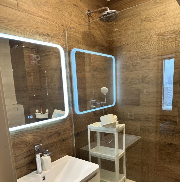 2 санузла (один с душевой, второй со стиральной машинкой, в обоих СУ подвесные унитазы и тумбы с раковиной),