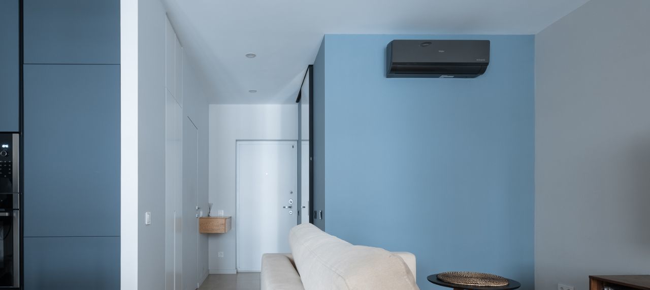 Климат: Сплит-система Haier (трасса скрыта, конденсат в канализацию).
