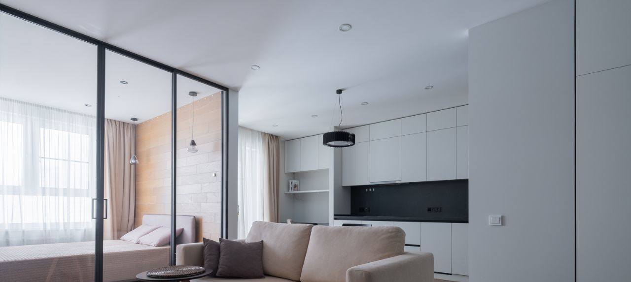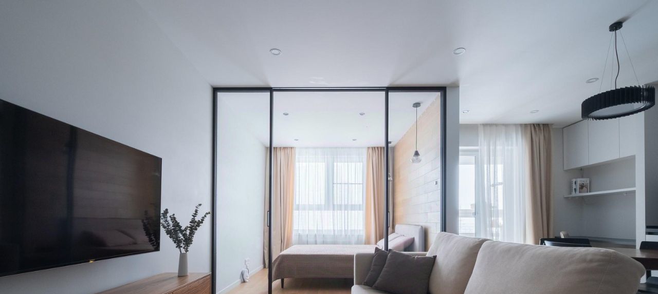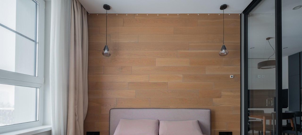 Спальня отделена стеклянной стальной раздвижной перегородкой (сохраняет воздух и объем пространства). Стена в изголовье — натуральная инженерная доска. В потолке сделана закладная под проектор + вывод HDMI. Продуманные сценарии света. Организовано скрытое рабочее место.