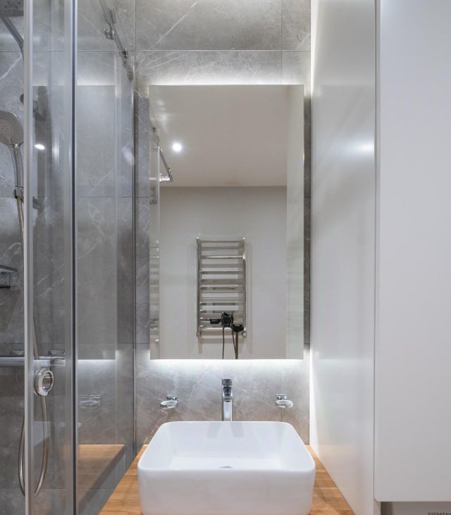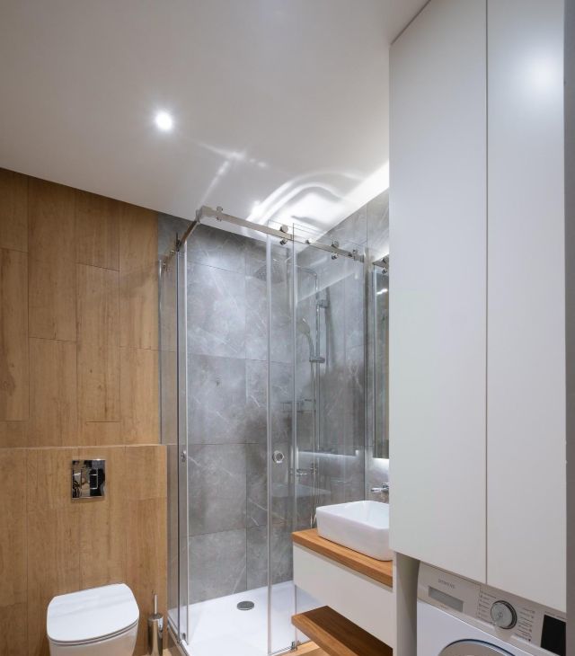 Просторный душевой поддон с тропическим душем. Сантехника Ideal Standard. Столешница из массива натурального дуба. Стиральная машина Siemens (остается).