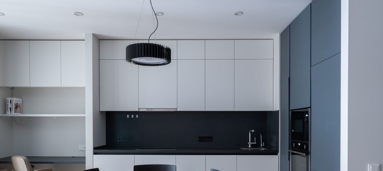 Фасады Fenix NTM (Италия) — суперматовый нано-пластик (анти-отпечатки, восстанавливается от тепла). Столешница и фартук — акриловый камень