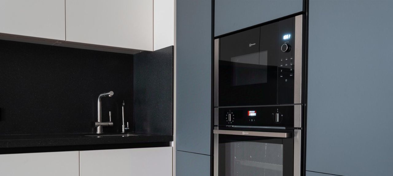 Техника NEFF (Германия): Индукционная панель, духовой шкаф, вытяжка, встроенная СВЧ, посудомойка (45 см). Встроенный холодильник Grundig. Система очистки воды (Обратный осмос).