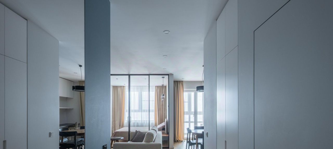 Вопрос вещей решен продуманно, визуального шума нет: Отдельная гардеробная с системой IKEA (вход через зеркальную дверь-купе). Встроенный шкаф в прихожей. На лоджии предусмотрено крепление для шоссейного велосипеда.