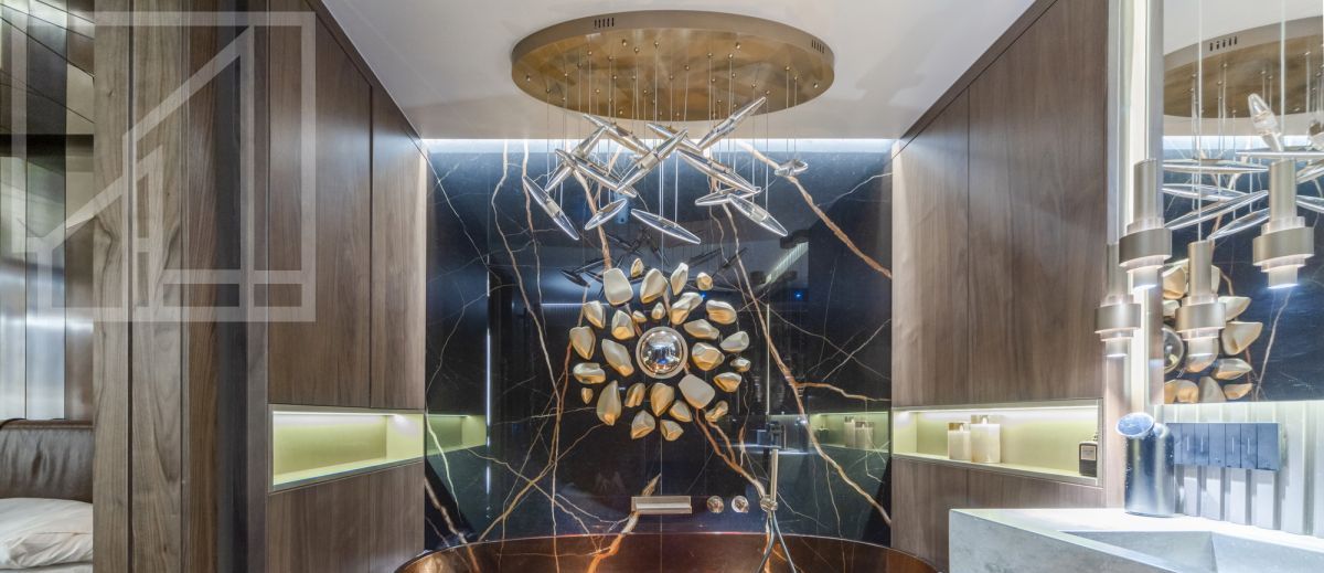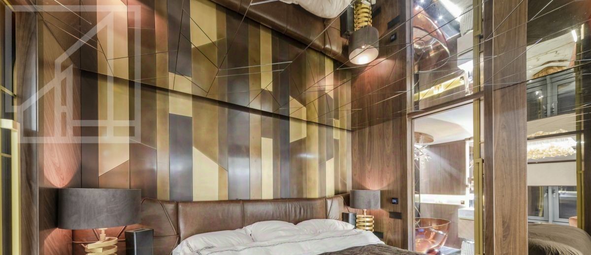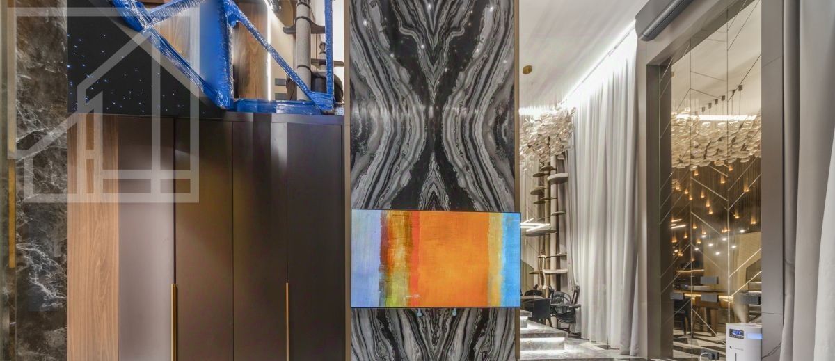 Лот 555279. Бонус коллегам! Двухуровневый пентхаус с биокамином и водопадом в комплексе "Талисман на Дмитровском" рядом с парком и рекой Лихоборка на севере Москвы. Дизайнерский интерьер, в отделке использован натуральный мрамор, гранит, ценные породы дерева. Квартира полностью меблирована и укомплектована техникой.