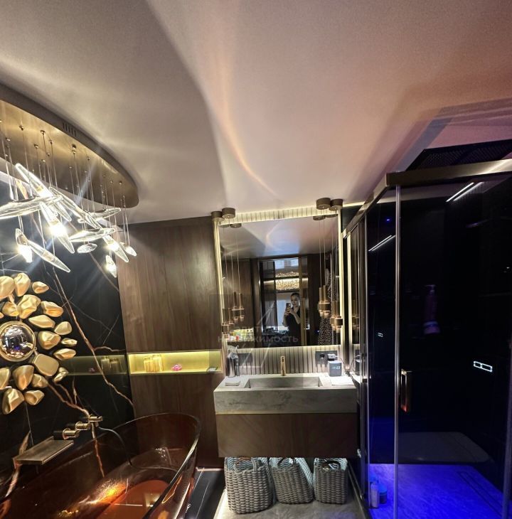 * Второй уровень: Мастер-спальня с проектором Samsung во всю стену, гардеробная комната с окном, ванная комната с ванной из янтарного стекла и душевой кабиной с цветной подсветкой.