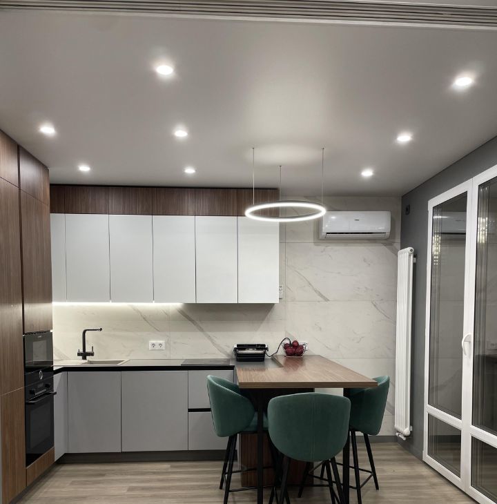 Трансформируемая кухня-гостиная: пространство кухни и зоны отдыха разделено эстетичной деревянной перегородкой. Это позволяет мгновенно зонировать помещения для работы или отдыха, сохраняя при этом приватность или объединить в просторный open-space.