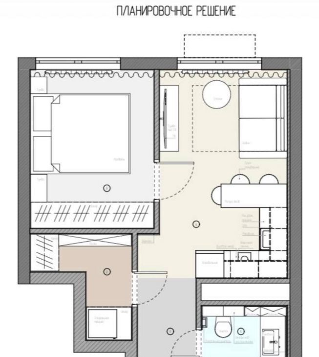 • функциональная планировка: Кухня-гостинная с полноценным двухместным раскладным диваном, спальня с кроватью на заказ и большим, вместительным встроенным шкафом во всю стену, отдельная гардеробная комната с продуманной зоной хранения, а также совмещённый санузел. Окна выходят во двор. Площадь по ЕГРН 32.1м²