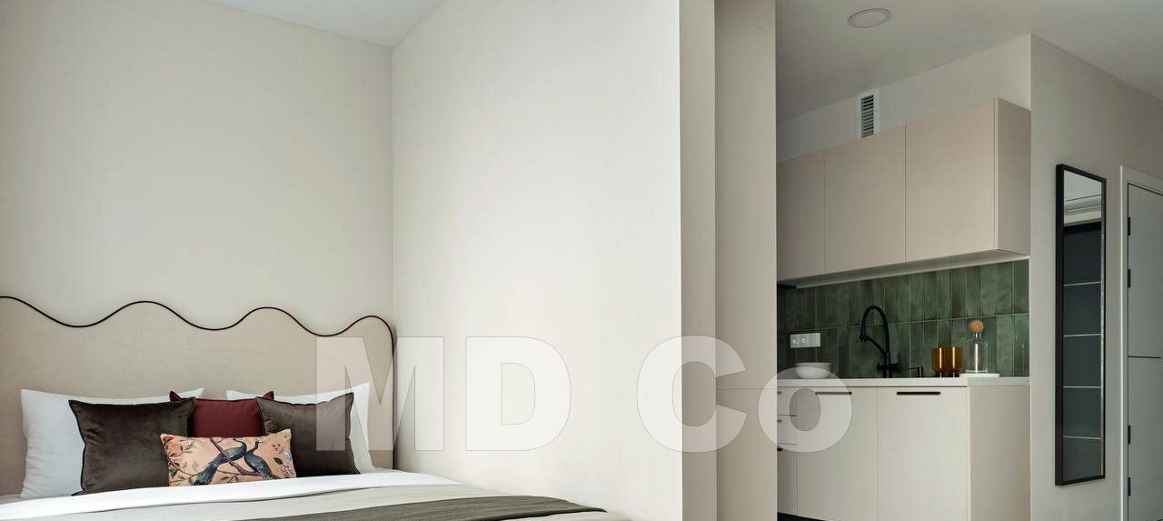 Планировка: Просторная кухня-гостиная (13 м²) для отдыха и приема гостей, уютная выделенная спальная зона (12 м²). Совмещенный санузел.