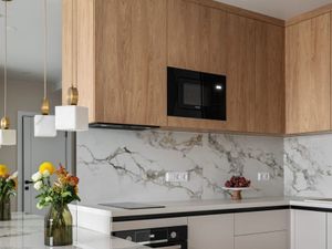 - вся техника встроенная: варочная панель, вытяжка, духовой шкаф, посудомоечная машина, холодильник,