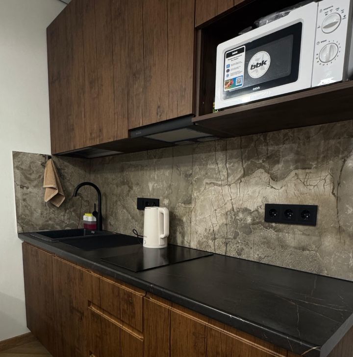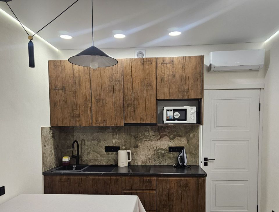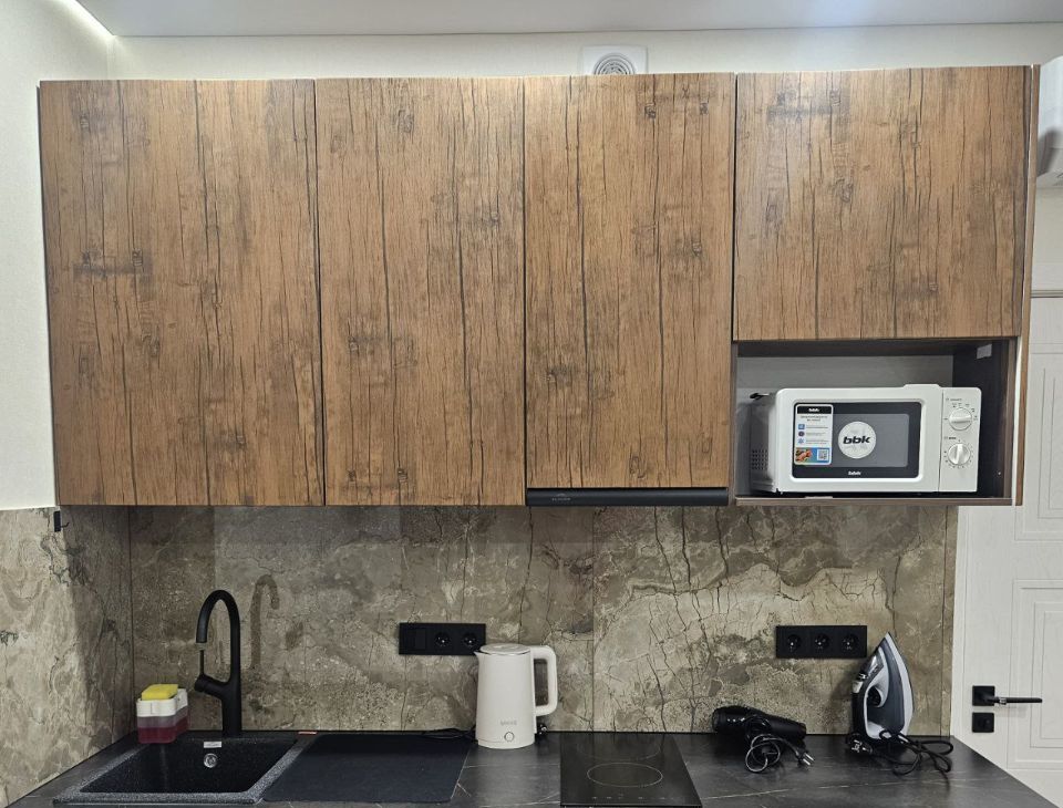 шкаф, микроволновая печь, вытяжка, установлен кондиционер.