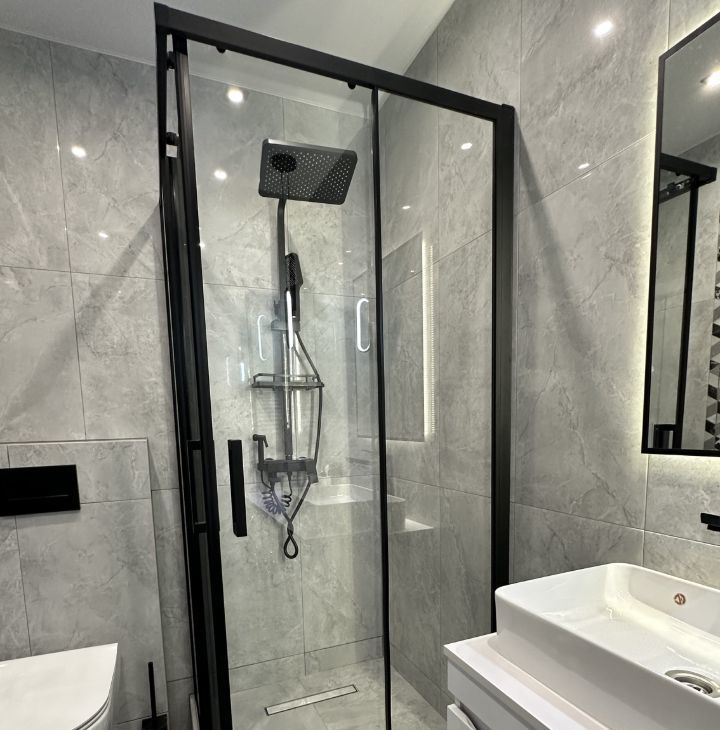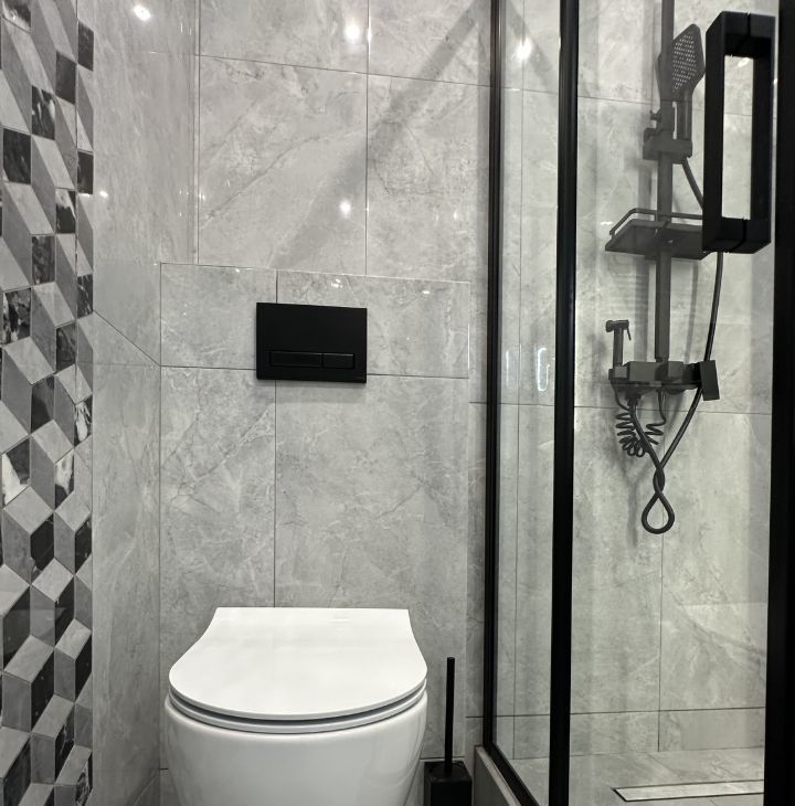 Ванная выполнена дизайнером в коллекции Keramo Maracci Rialto в светло серых тонах с 3D мозаикой. Есть стиральная машина, удобная душевая кабина и целая стена с подогревом для комфортной сушки ваших халатов и полотенец (кстати - полотенца мы тоже уже подготовили).