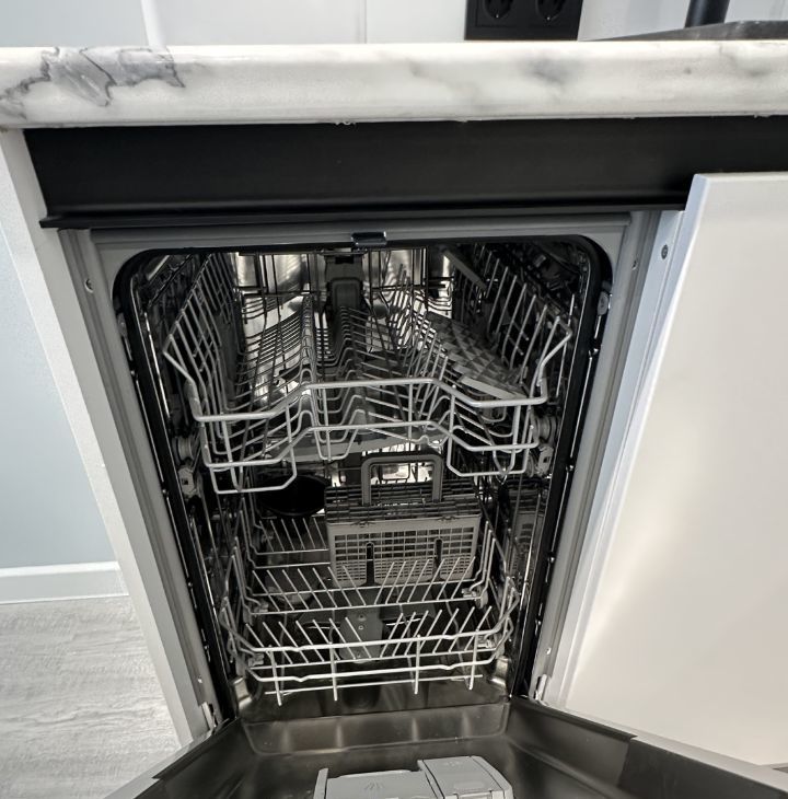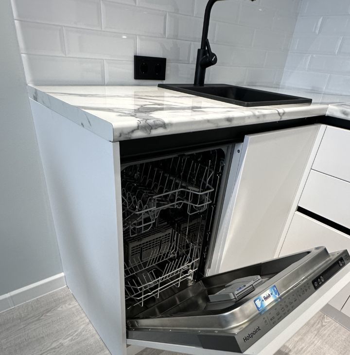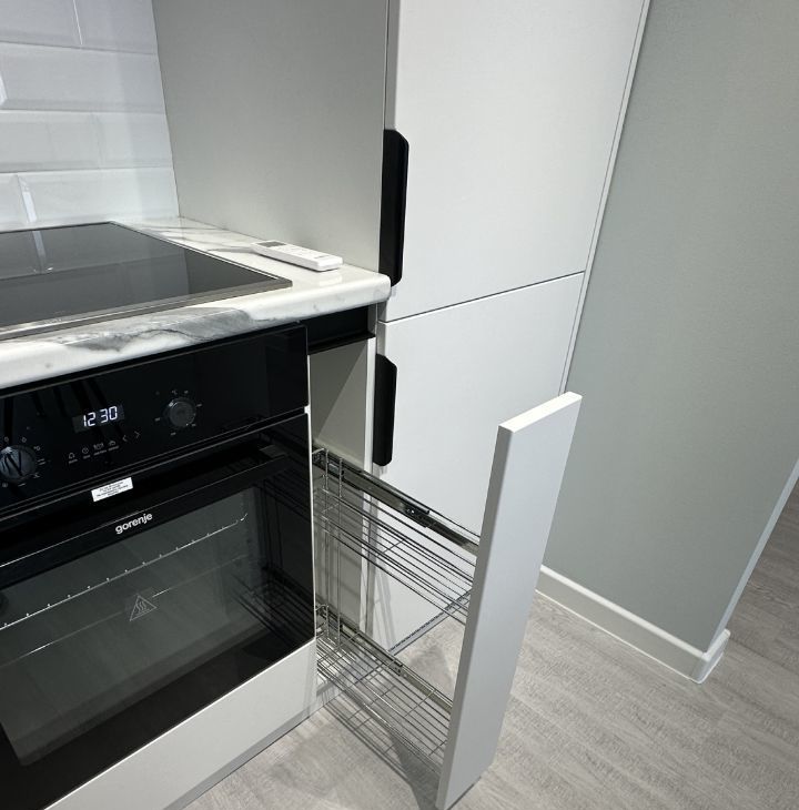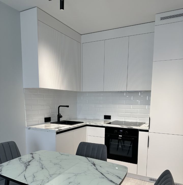 Кухня-гостиная спроектирована в правильных формах. Зона отдыха максимально разведена от кухонной, что позволяет комфортно отдыхать и готовить ужин. Кухня выполнена в белых тонах имеется все оборудование - духовой шкаф, варочная поверхность, микроволновка, холодильник, посудомоечная машина (все встроено), также вас ждут комплект посуды, чайник, столовые приборы и даже ведерко для бытовых отходов! В квартире также установлен поточный подогрев воды, так что при отключении у вас всегда будет своя горячая вода.