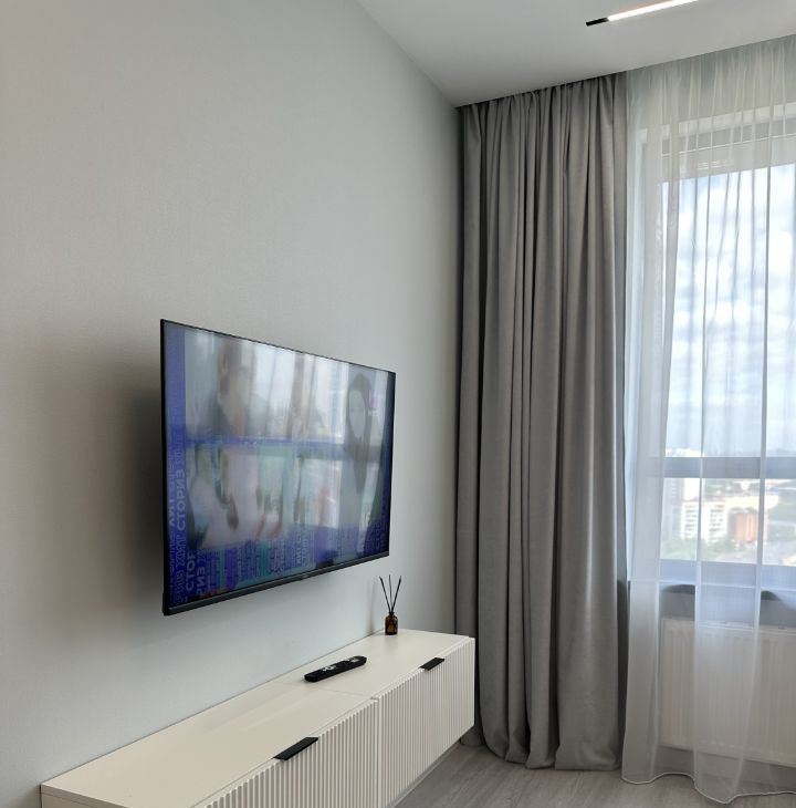 Гостиная зона укомплектована ТВ комфортного размера, ТВ подключен к интернету через кабель (что сейчас крайне важно) подготовлены все необходимые выводы для подключения вашей приставки, которая очень хорошо приземлится на консоль под ТВ. В квартире проведен опто-волоконный интернет с высокой скоростью, роутер прекрасно раздает WI-fI, провода проведены в комнаты.