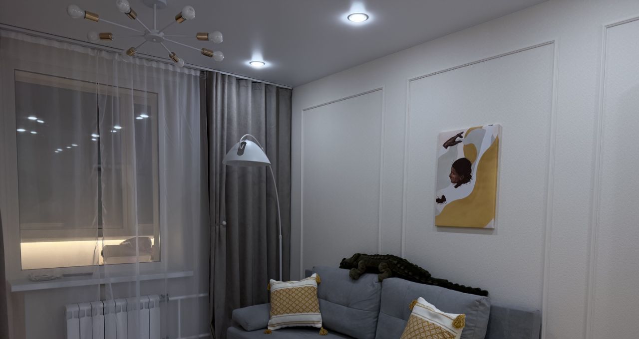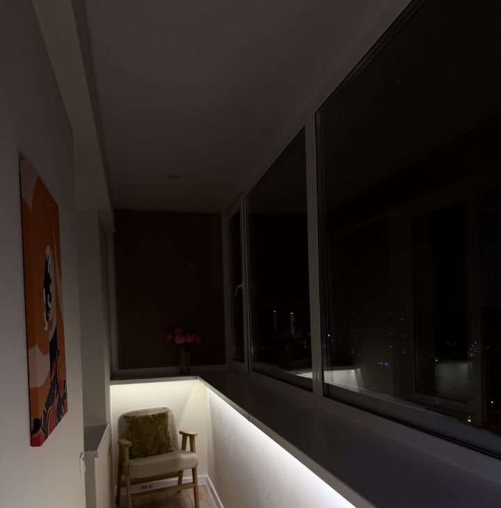 -большой утепленный балкон с системой подогрева полов и двумя видами освещения