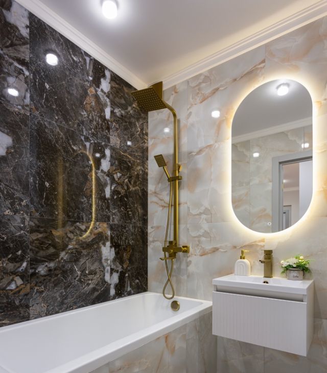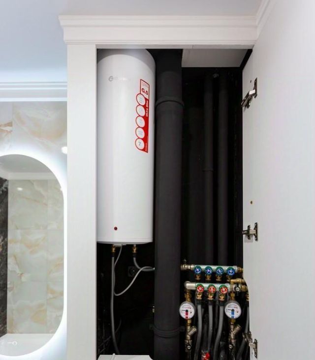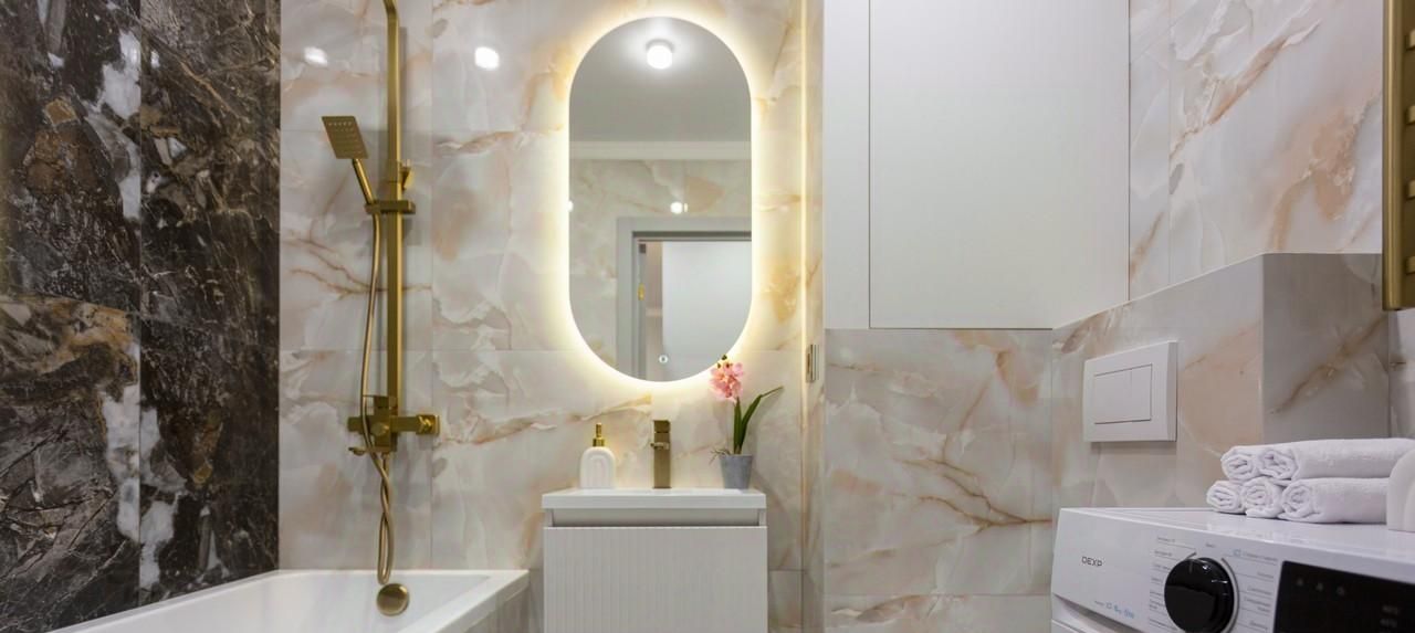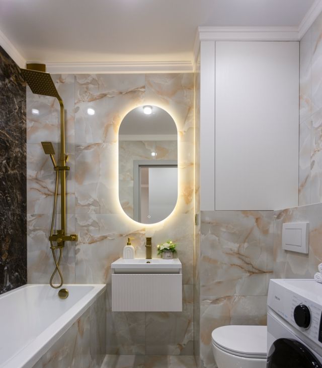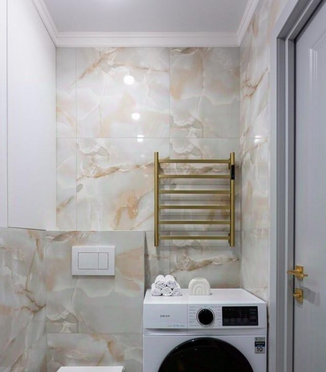 - Дизайнерский санузел с полноценной ванной и тропическим душем. Комфорта добавляет водонагреватель и стиральная машина.