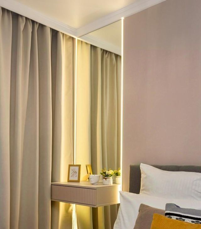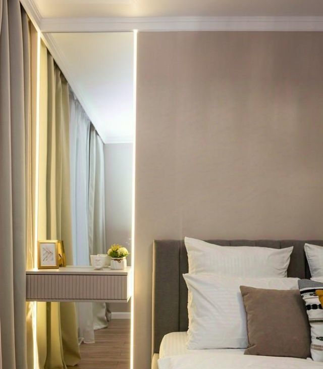 - Просторная уединенная спальня с двуспальной кроватью с подъемным механизмом. А так же гримерным зеркалом с подсветкой и тумбой. Так же в спальне есть свободное место под шкаф либо под детскую кровать.