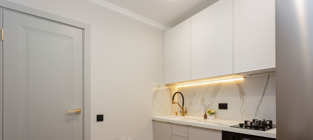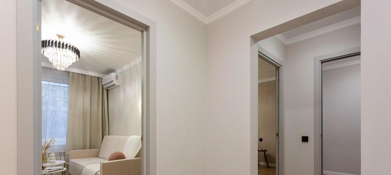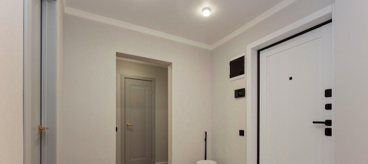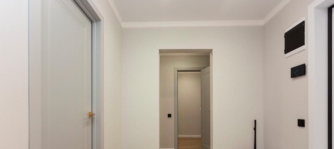 - Интерьер выполнен в мягких кремово-бежевых и серых тонах. Спальная, гостиная , отдельная гардеробная и кухня.