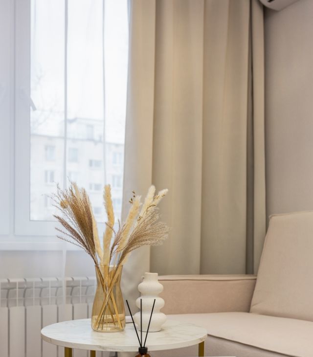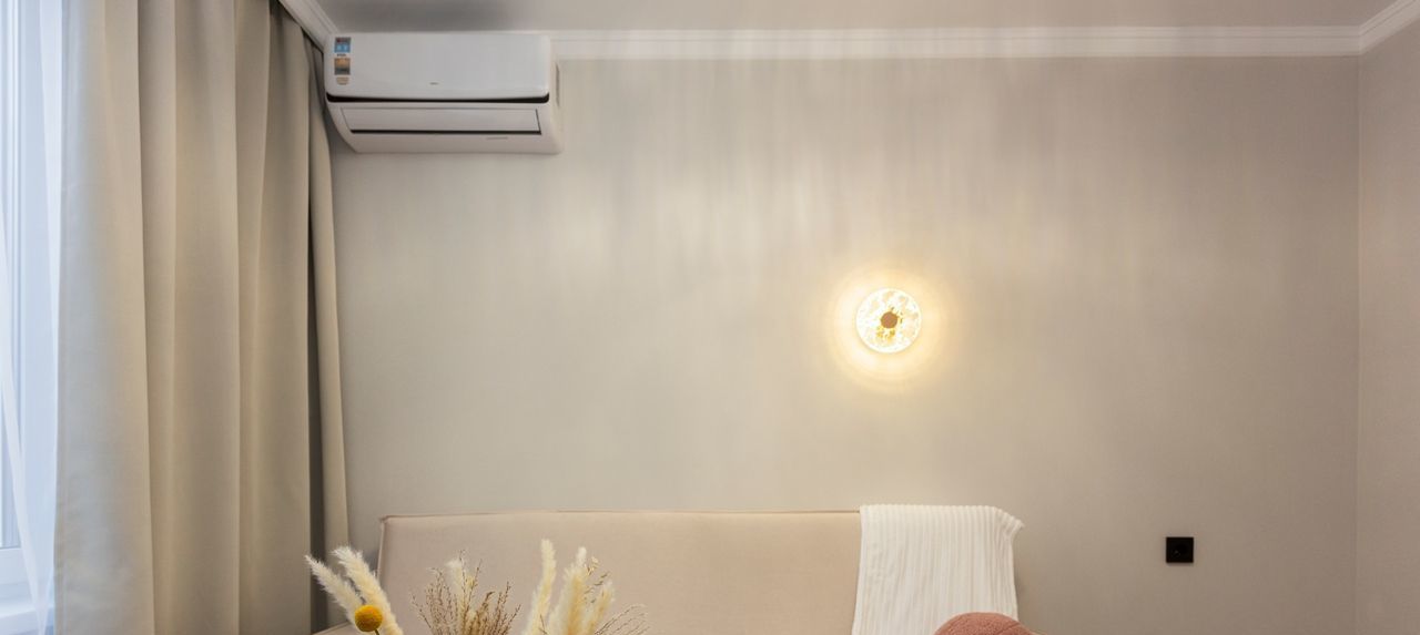 - Светлая гостиная с раскладывающимся диваном, с ТВ зоной, и сплит системой кондиционер (тепло и холод)