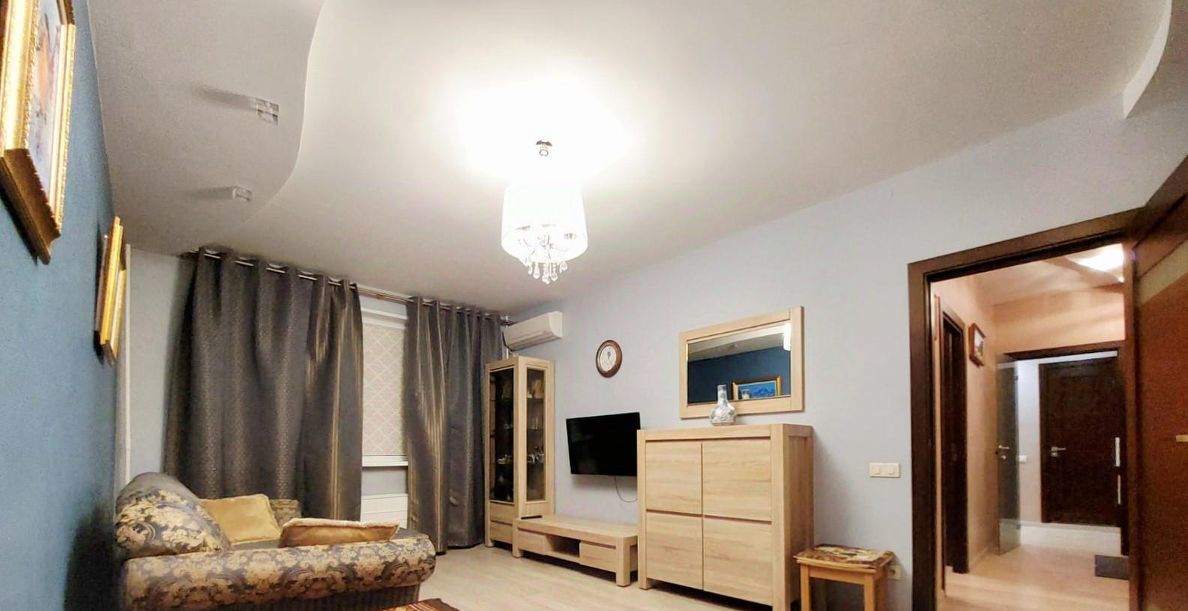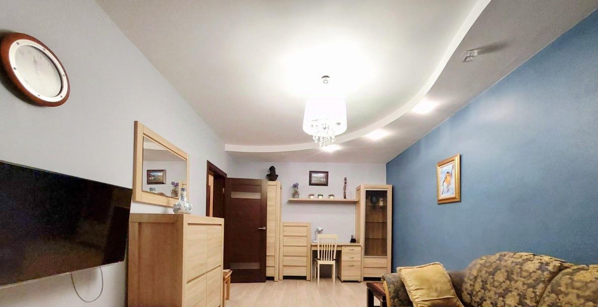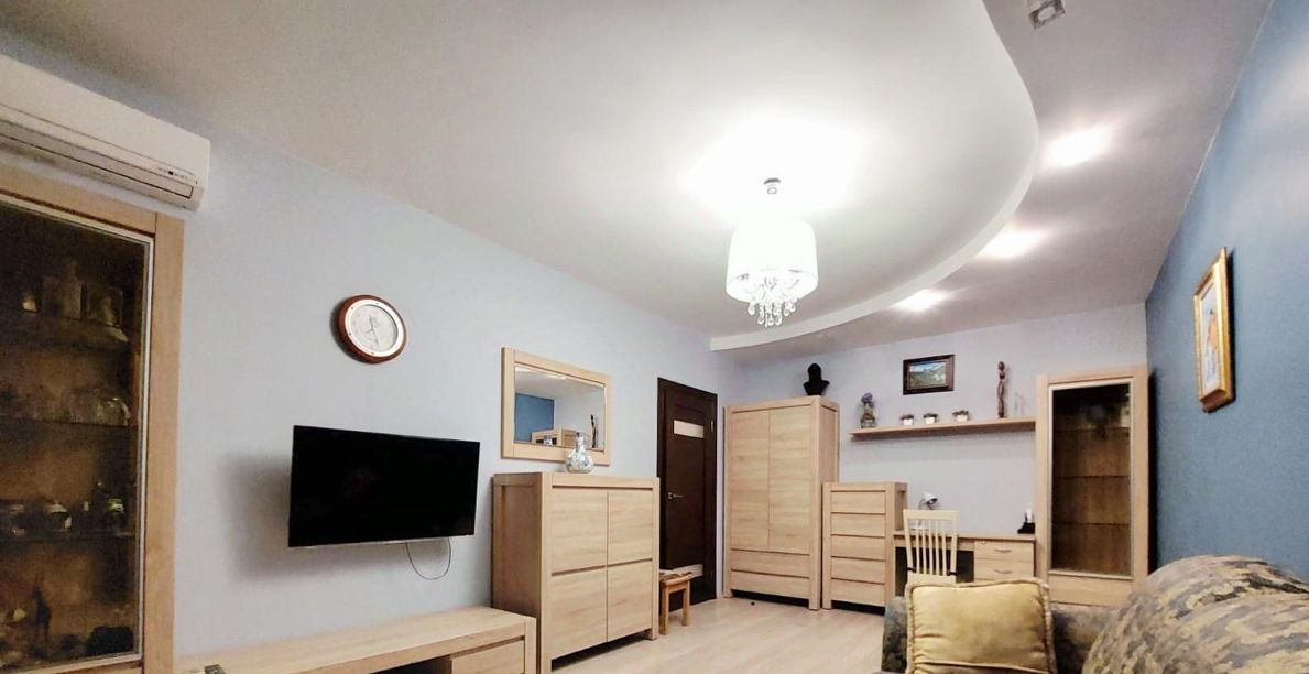 В гостиной ортопедический диван( раскладывается в удобное спальное место), комплект корпусной мебели, есть рабочее место - стол+ стул, кондиционер, телевизор жк.