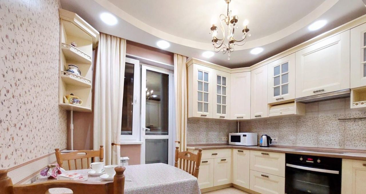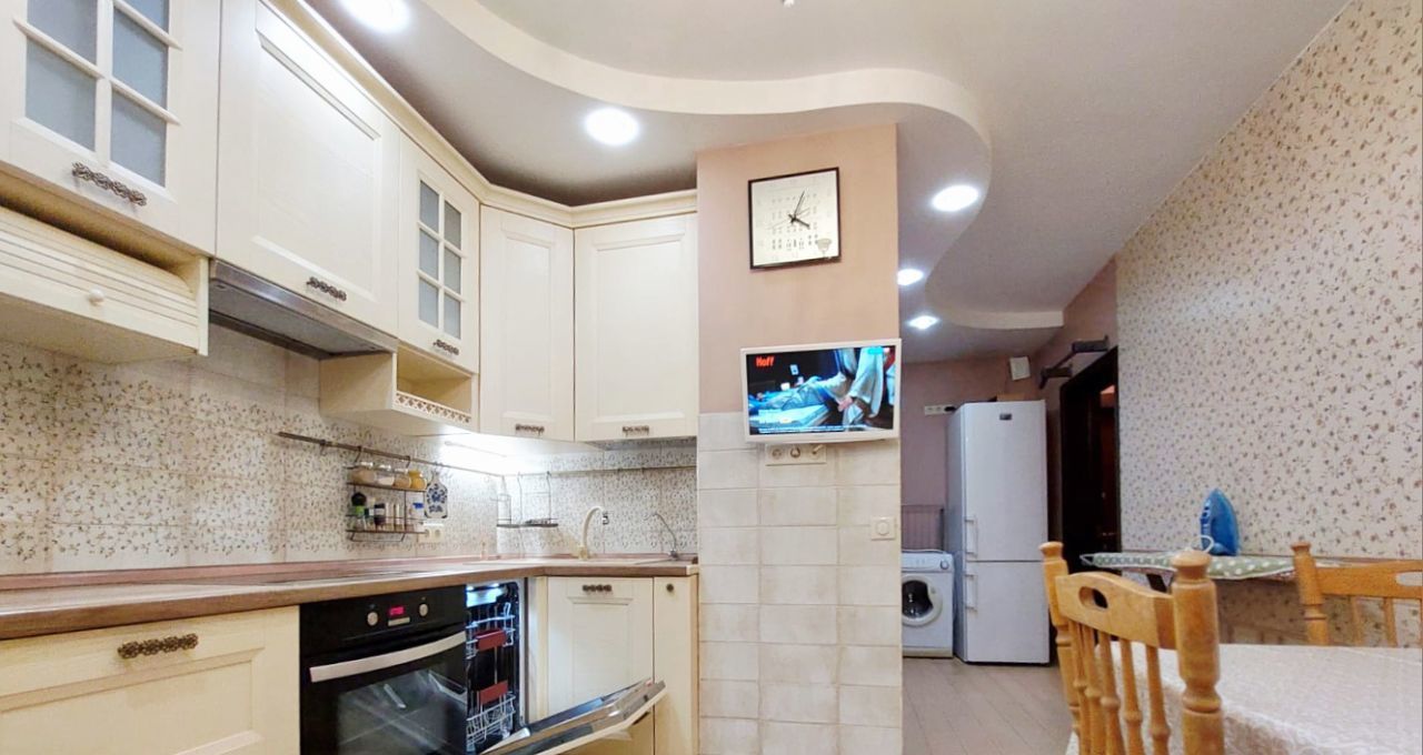 В кухне - красивый гарнитур, со всей встроенной бытовой техникой - варочная стеклокерамическая панель, духовой шкаф, вытяжка, посудомоечная машина, встроенный фильтр питьевой воды, СВЧ, тостер, 2х камерный холодильник Либхер, есть посуда - для приготовления еды (кастрюли, сковороды, доски и т.д), столовая ( приборы, тарелки).