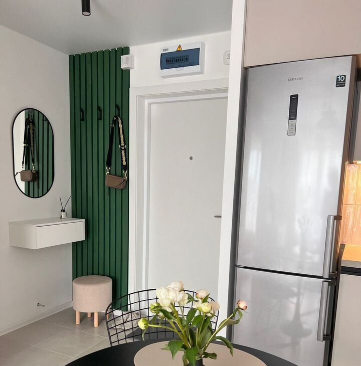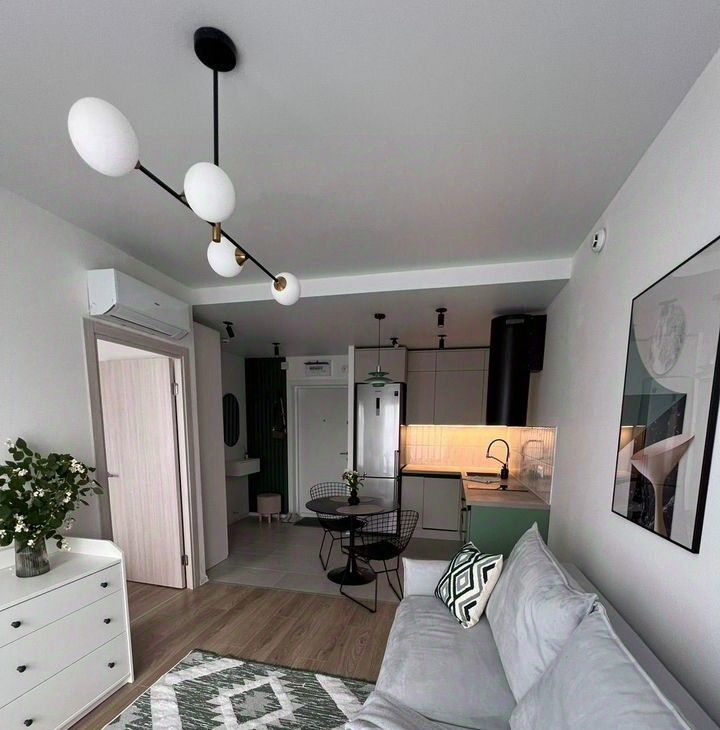 Просторная квартира с евро ремонтом, оборудована всем необходимым: кондиционером, холодильником, микроволновкой, плитой, теливизором, стиральной машиной и высокоскоростным интернетом. Из мебели — вместительные шкафы, двухспальная кровать и удобный диван. Кухня компактная, но функциональная, оснащена всей необходимой техникой