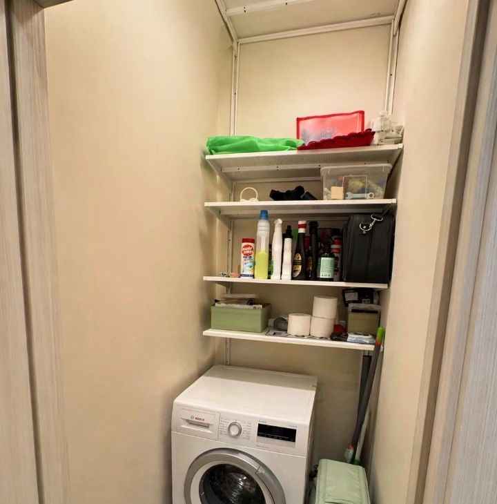 Стиральная машина Bosch и полки для хранения.