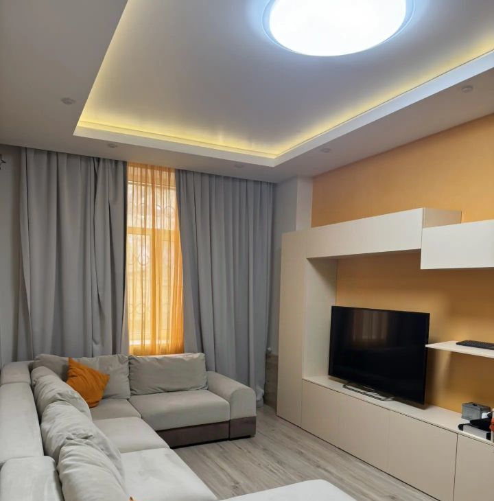 Гостиная с большим комфортным диваном и ТВ-зоной.