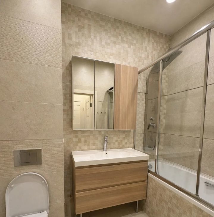 Ванная с душем и стеклянными шторками, унитаз, гигиенический душ и бойлер на 40 литров! (Вы забудете о сезонном отключении горячей воды)