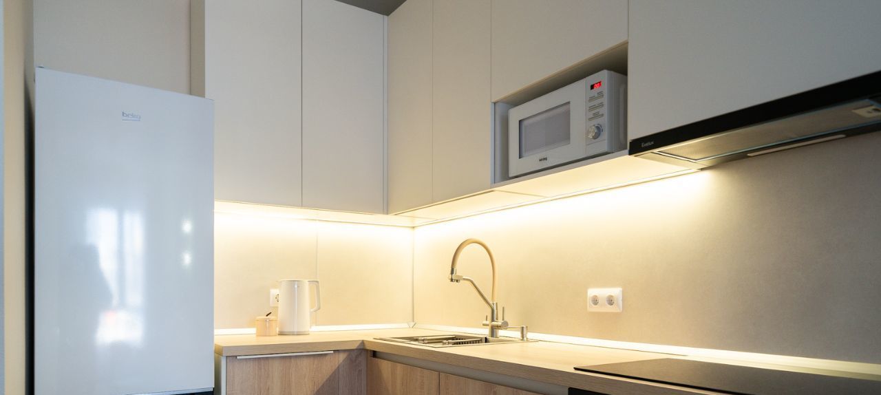 Бытовая техника: стиральная машина ( с сушкой), посудомоечная машина, холодильник, духовой шкаф, варочная панель, микроволновая печь, кондиционер, телевизор по запросу