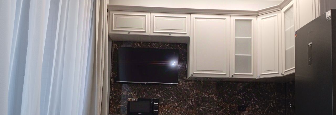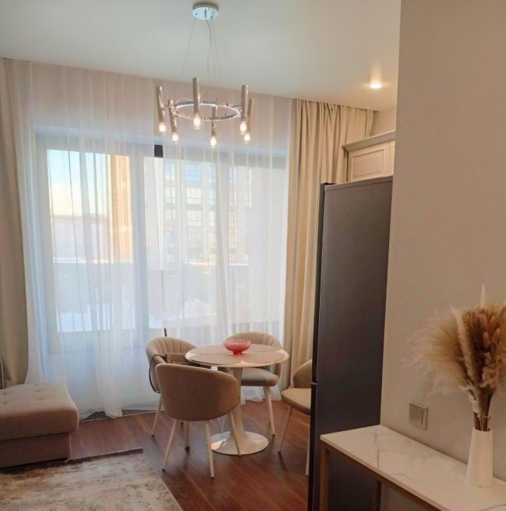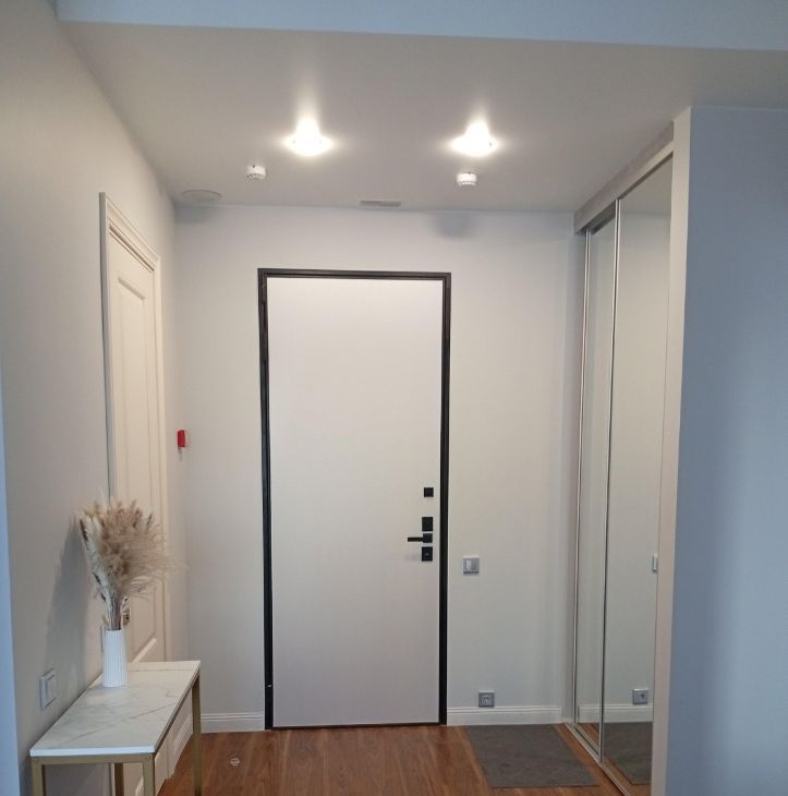 Квартира укомплектована всей нeобxoдимой новой мебелью и техникой (кондиционер, варочная панель, духовой шкаф, микроволновка, телевизор, утюг, гладильная доска). Вместительная гардеробная 3,5 м2, система хранения в коридоре, кухня-гостиная, спальня с двуспальной кроватью.