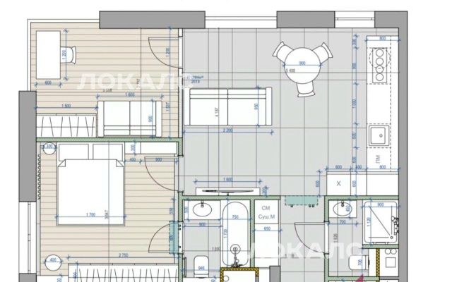 Планировка: спальня со своим с/у, вторая спальня/кабинет, кухня-гостиная, гостевой с/у и гардеробная.