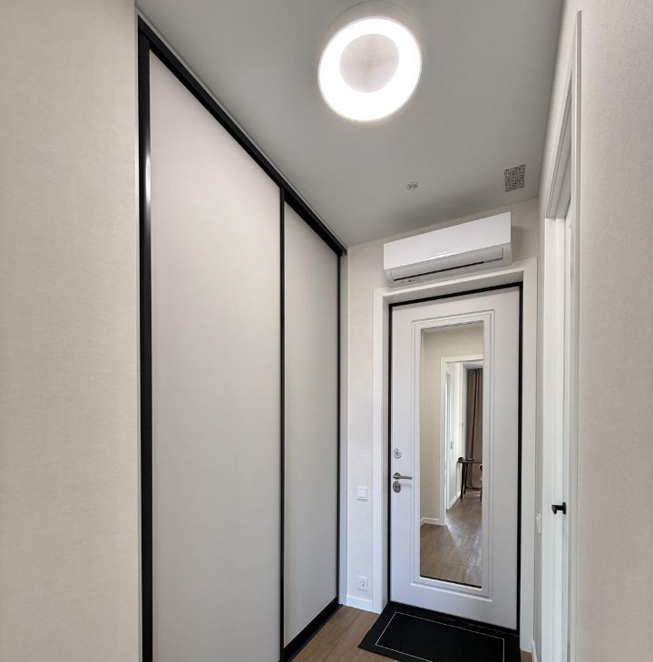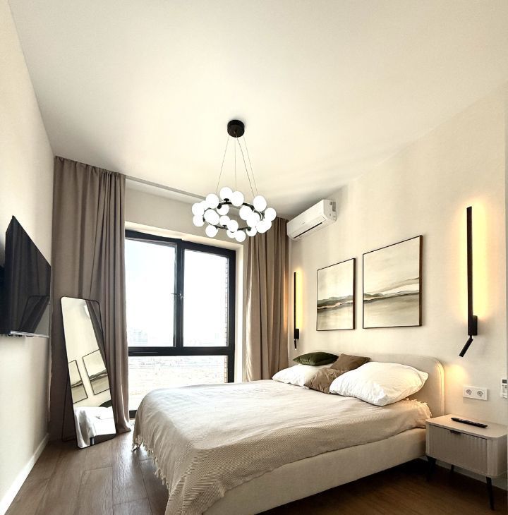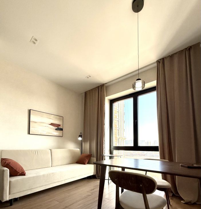Выполнен качественный дизайнерский ремонт с европланировкой и панорамными окнами. Изолированная спальня с совмещенным санузлом, кухня-гостиная и гардеробная. Вcтpоенные шкафы по периметру, дорогая мебель и техника от именитых производителей. Подземный паркинг через домовой чат.