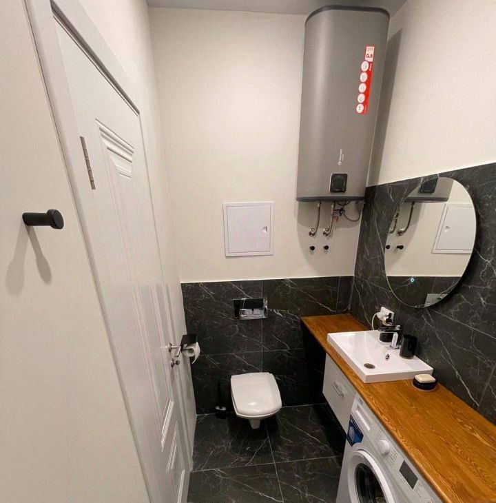 В квартире есть всё необходимое для комфортного проживания: холодильник, стиральная машина и кондиционер.