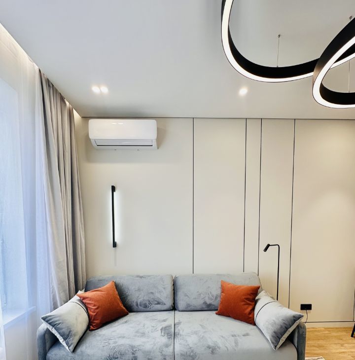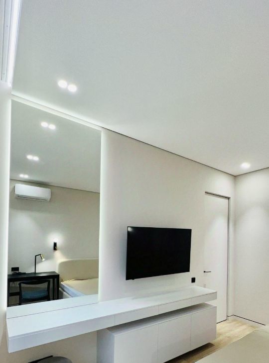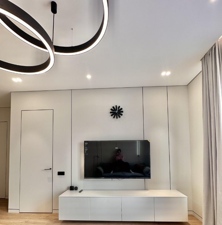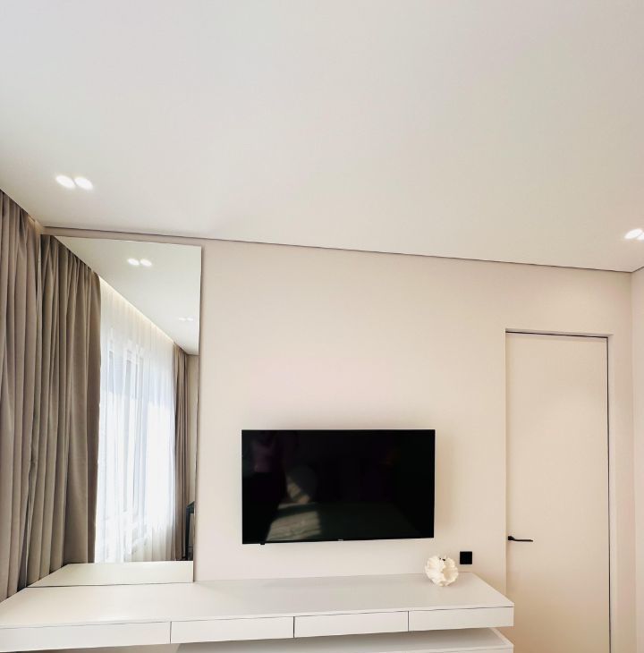 - гостиная зона: телевизор, диван (раскладывается), дизайнерский стильный журнальный столик, настенные часы, торшер, бра, уютный ковер, тумба подвесная;