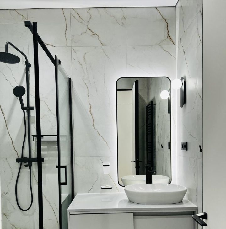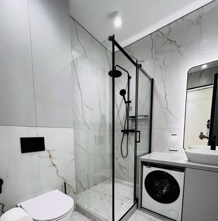 - ванная комната: душевая кабина, зеркало, санузел, постирочная зона со стиральной машиной 2в1 сушилкой и теплый пол.