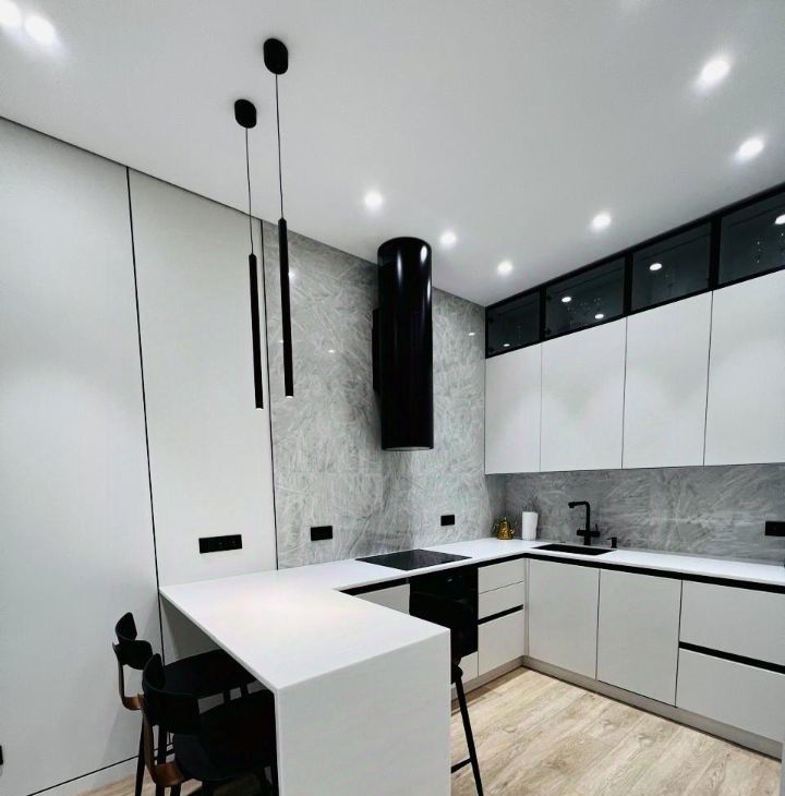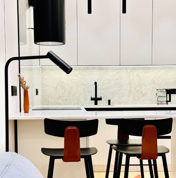 - кухонная зона: полу барный стол с тремя стульями, кухонный гарнитур со всей необходимой бытовой техникой и посудой.