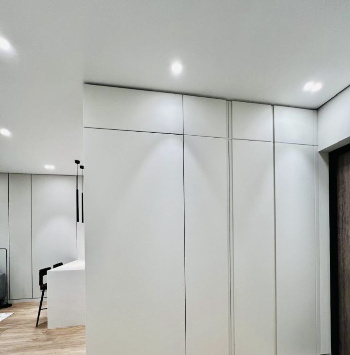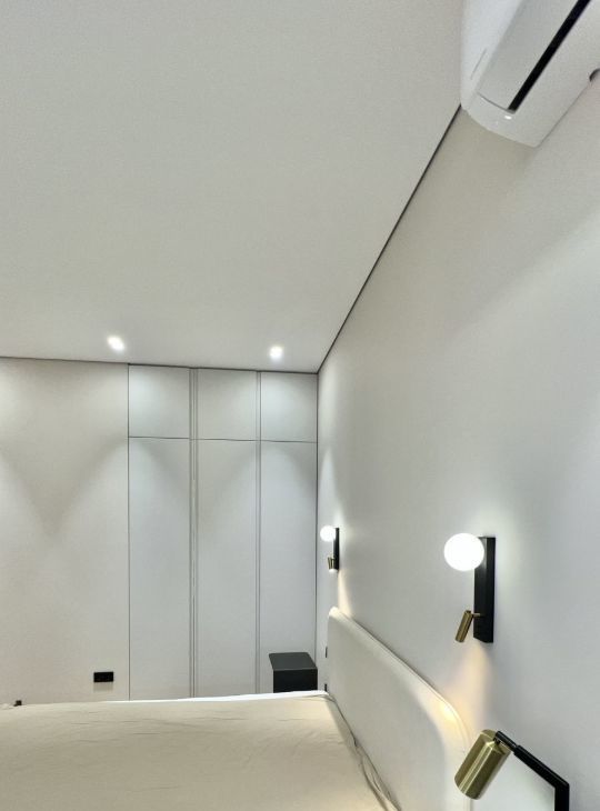 - изолированную спальню со шкафом, зеркало, прикроватной тумбой, рабочая зона кабинета, туалетный стол и пуф, зоной ТВ, вместительным подвесным комодом, двуспальная кровать с подъёмным механизмом;