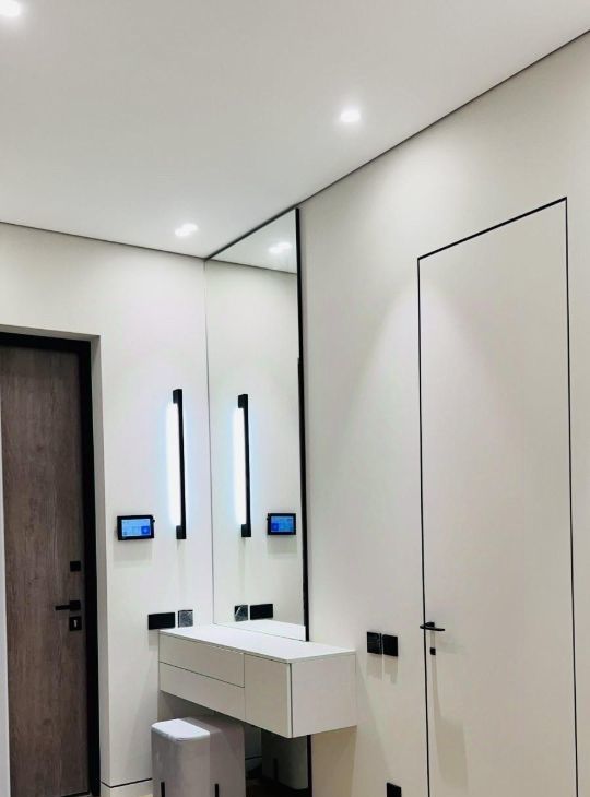- прихожая с пуфиком, зеркало на весь рост, гардероб, тумба, бытовой шкаф, шкаф для хранения, бра, видеодомофон;