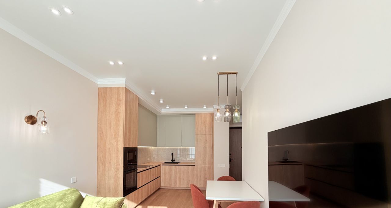 Выполнен дорогой и качественный ремонт с использованием натуральных материалов. Планировка: кухня- гостиная- столовая, спальня, совмещенный санузел с душем.