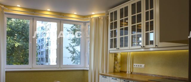 Просторная и светлая кухня с эркером (13 кв.м.). На кухне новый вместительный гарнитур IKEA, кухонный стол и стулья, вся необходимая техника (индукционная плита, вытяжка, духовой шкаф, посудомоечная машина, холодильник).