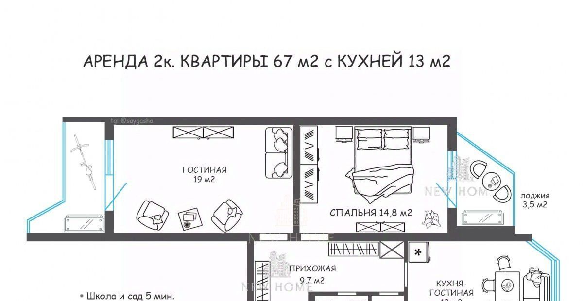 АРЕНДА 2к КВАРТИРЫ 67 м2 с КУХНЕЙ 13 м2