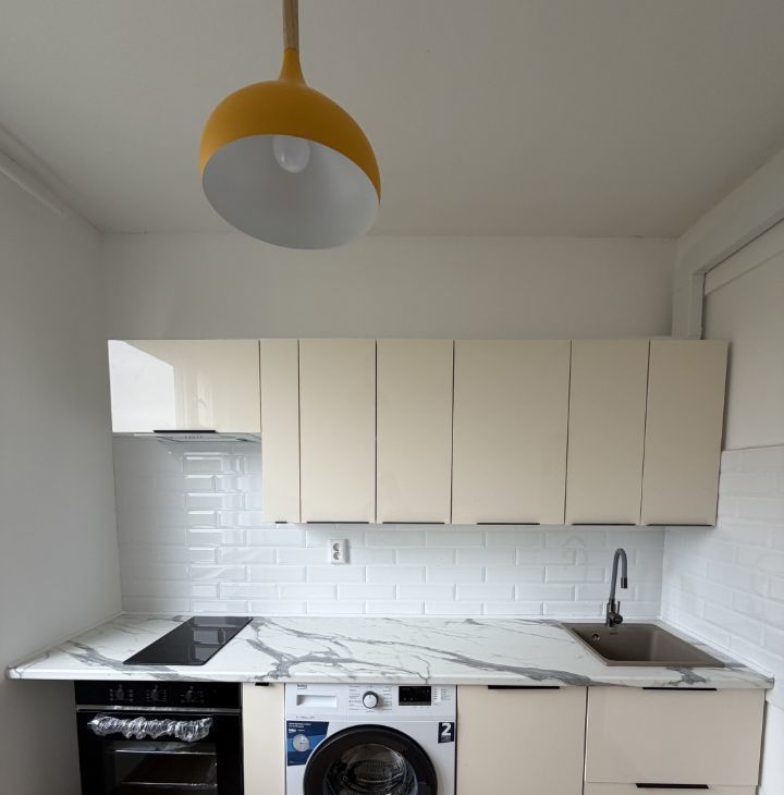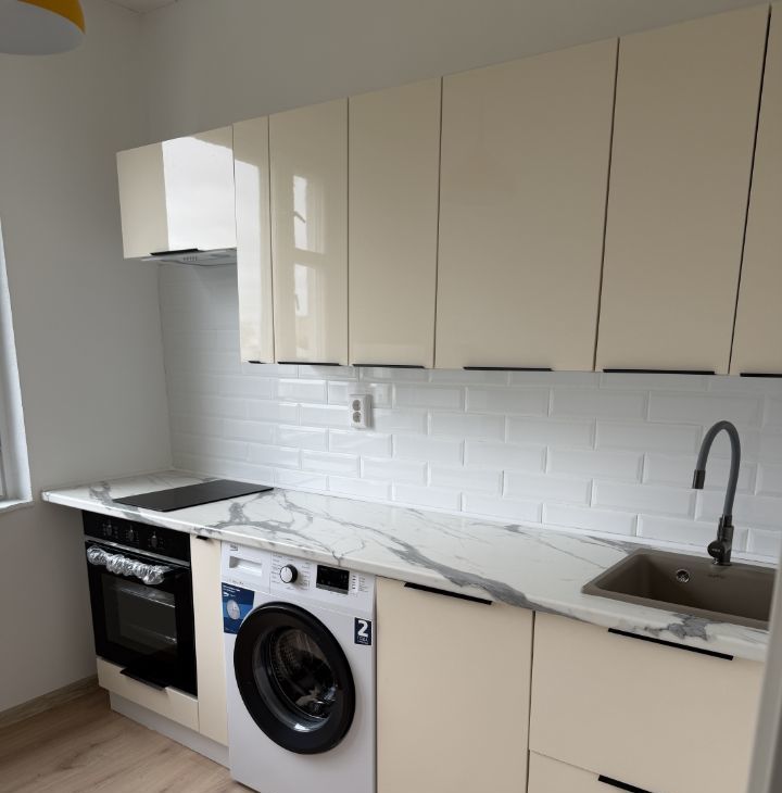 Полностью новая кухня с удобной рабочей зоной и всей необходимой техникой: холодильник, посудомоечная машина, стиральная машина, духовка.